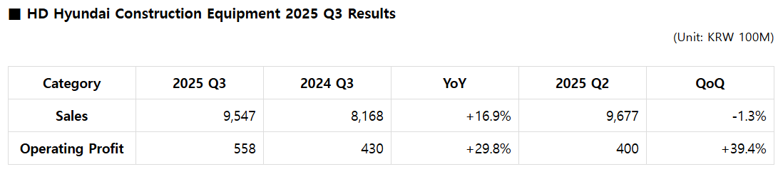 On the 29th, HD Hyundai Construction Equipment announced that it recorded sales of 954.7 billion won and an operating profit of 55.8 billion won in the third quarter of 2025.