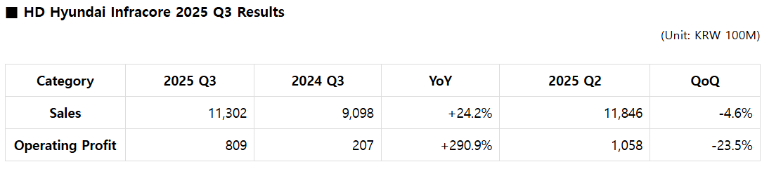 HD Hyundai Infracore Q3 Results: Sales Reach 1.1302 Trillion Won, Operating Profit Hits 80.9 Billion Won