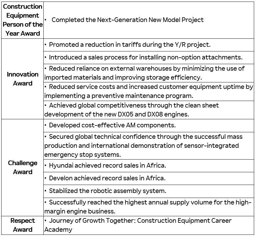 During the ceremony, a total of 13 awards were presented: one Construction Equipment Person of the Year Award, five Innovation Awards, six Challenge Awards, and one Respect Award. The top honor, the Construction Equipment Person of the Year, was awarded for the completion of the Next-Generation New Model Project.