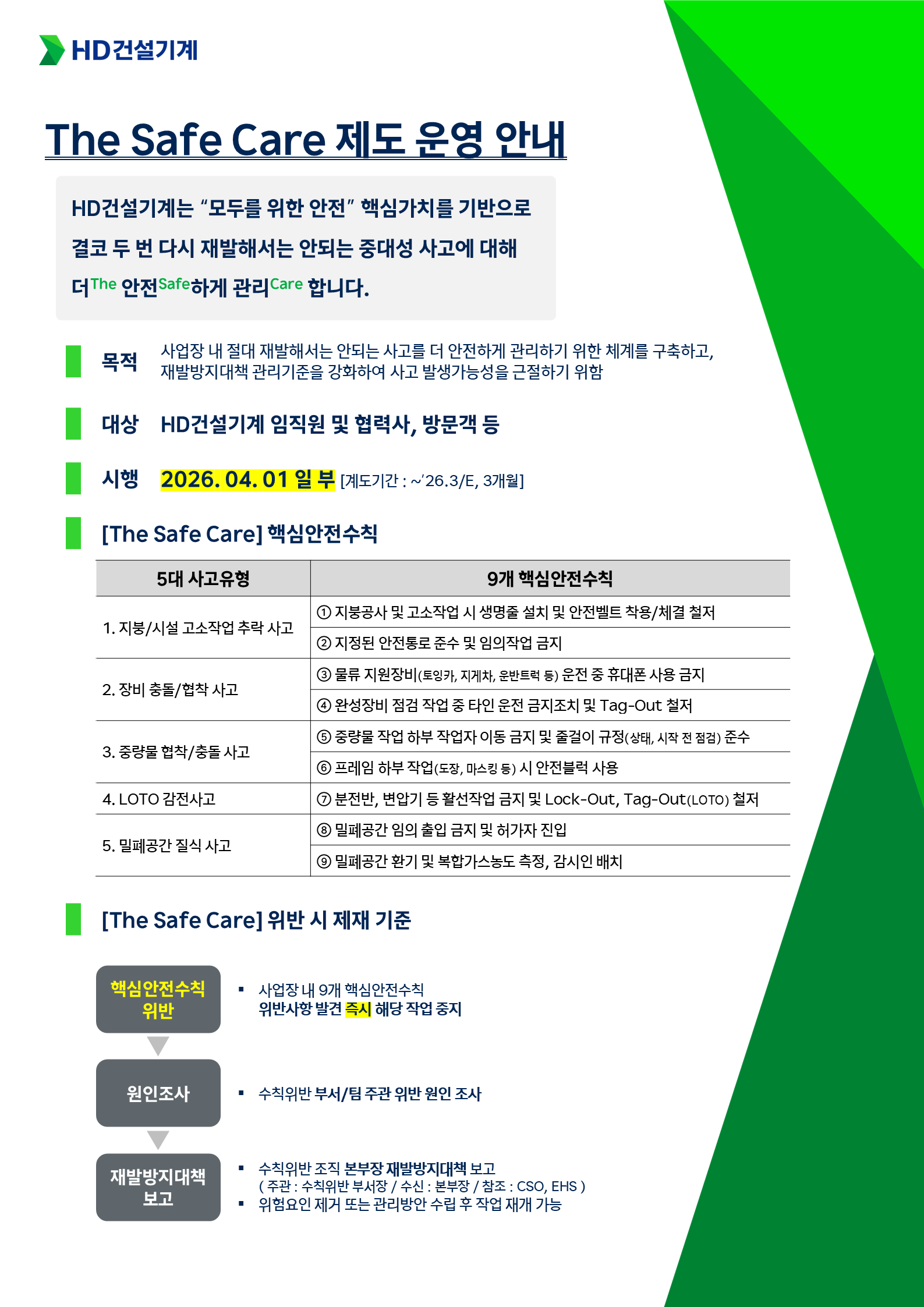 The Safe Care includes nine core safety rules that must be strictly followed at all HD Hyundai XiteSolution and HD Construction Equipment locations. These rules were developed based on prior major accidents in the construction equipment manufacturing industry and address five primary types of accidents: ▲falling, ▲crushing, ▲collision, ▲electrocution, and ▲asphyxiation. The rules apply to all individuals visiting the sites, including employees, contractors, and visitors.